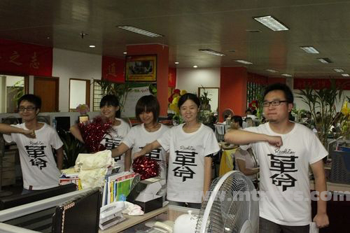 团队组第三名,策划部代表队。专门定制的T恤,这个动作是“革命”。
