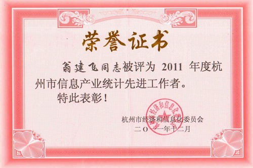 2011年12月23日,杭州市经济系信息化委员会办公室发文,表彰了全市50位“2011年杭州市信息产业统计先进工作者”,米兰官方网站-米兰(中国) 财务主管翁建飞获得“先进工作者”殊荣。