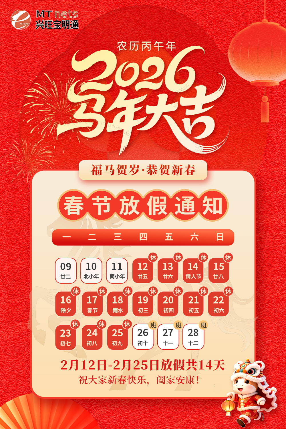 最后,再次祝愿全体员工及家人:新春快乐,马年大吉!身体健康,阖家团圆,万事顺意,喜乐常安!愿我们新岁同心,共赴新程,不负时光,不负韶华,继续并肩,再创辉煌!