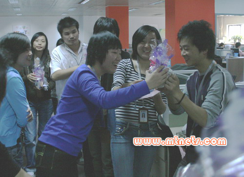 明通公司9月生日的员工一起分享生日蛋糕,握着特殊的礼物,彼此送出生日的祝福!
