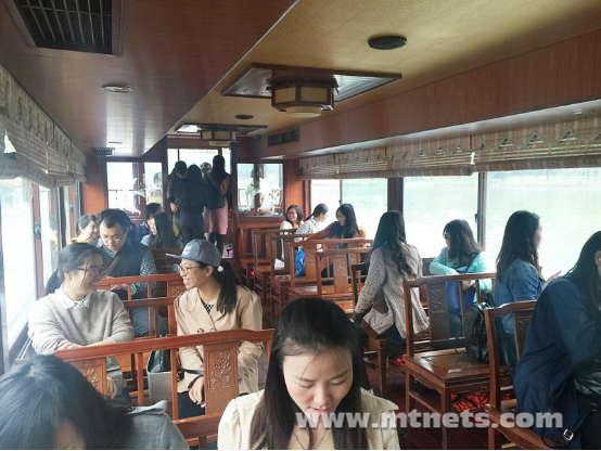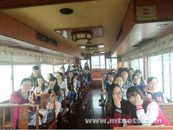 因为是雨天,编辑部岸上的步行观光,只在下孙文化村附近。在下孙船埠,我们便坐上了一艘大游船,开始长达1小时的环湖观景。船上,听导游介绍着两岸历史文化和奇特景观。