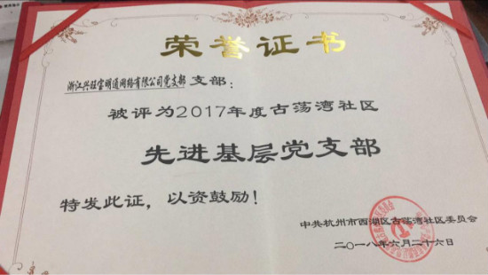 党支部荣获“2017年度先进党支部”称号,其中兴旺宝党支部成员练龙波、吴娟玲被评为“2017年度党员积极分子”。